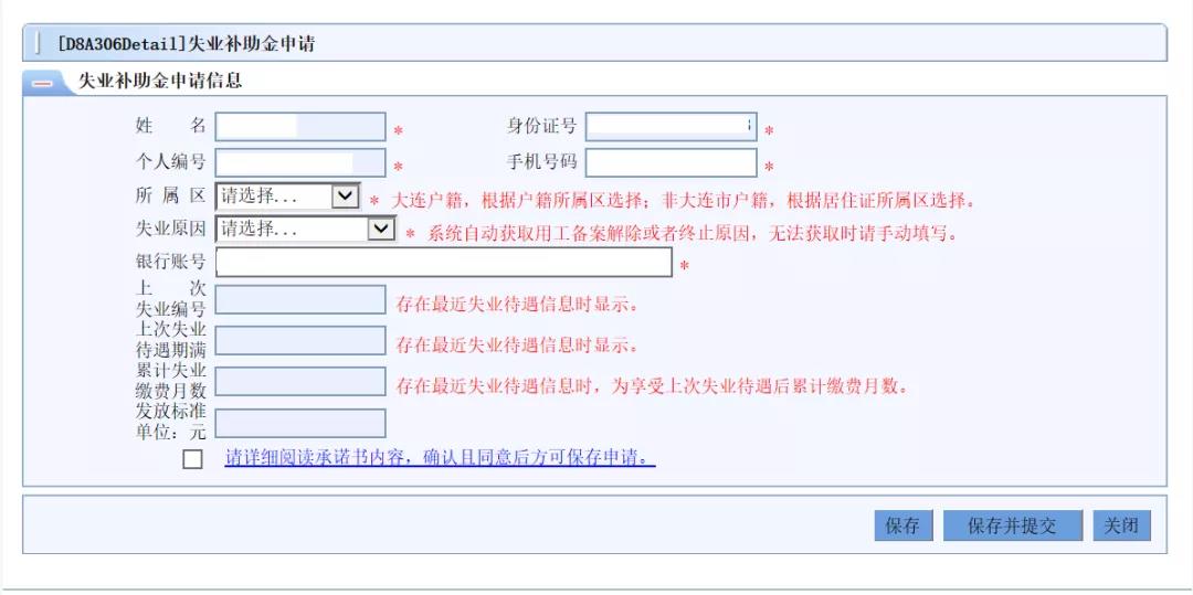 步驟四:點擊失業(yè)補助金申請模塊,系統(tǒng)自動獲取社會保障卡號,錄入個人基本信息(填報信息里帶*號的必填,不帶*號的不用填),簽訂申領(lǐng)失業(yè)補助金承諾書,在確認無誤后按“保存并提交” 鈕上傳申領(lǐng)數(shù)據(jù)。如持有承載失業(yè)保險待遇發(fā)放的八家銀行(工商銀行、農(nóng)業(yè)銀行、中國銀行、建設(shè)銀行、交通銀行、大連銀行、郵政儲蓄銀行、農(nóng)商銀行)的社會保障卡,需先到社?òl(fā)卡銀行開通社保卡金融功能(開通后五個工作日后再申請),確保正常領(lǐng)取失業(yè)補助金待遇。如持有其他銀行的社?▌t需錄入大連銀行卡號申領(lǐng)。